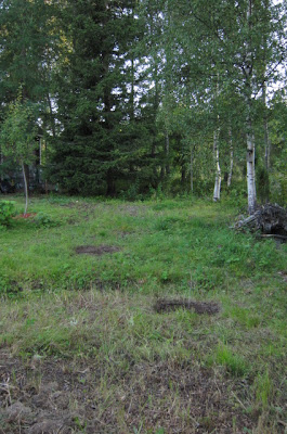 Hieman toisaalta myöskin tämä "kaunis" näkymä - risukasa odottaa kuskaajaa ja lisämaata tarvitaan, että tähän saisi tasaisen nurmikon. Parissa kuopassa kasvaa pienet alut mongolianvaahteraa ja syreeniä.